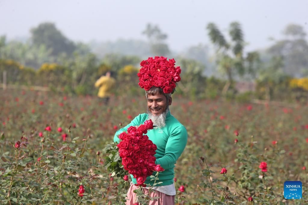 A gardener picks roses in Dhaka, Bangladesh, Dec. 12, 2024. In Savar on the outskirts of Dhaka, millions of roses are in full blossom, attracting city dwellers to flee to the natural splendor. (Xinhua)