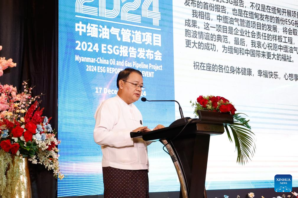 Li Haiping, vice president of Southeast Asia Crude Oil Pipeline Co., Ltd. and Southeast Asia Gas Pipeline Co., Ltd., speaks at the launching event of the ESG (Environmental, Social, and Governance) report of China-Myanmar Oil and Gas Pipeline Project in Yangon, Myanmar, Dec. 17, 2024. (Xinhua/Myo Kyaw Soe)
