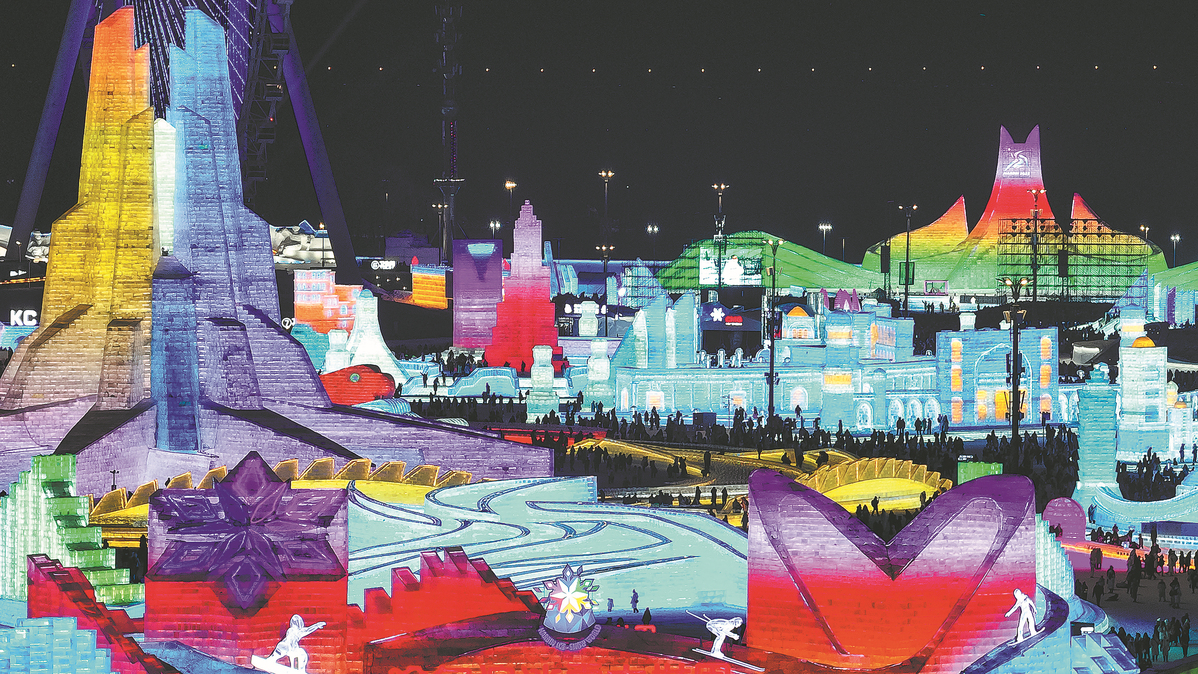 The colorful Harbin Ice and Snow World in the capital of Northeast China's Heilongjiang province opens to the public on Saturday. The theme park, built with 300,000 cubic meters of ice and snow and covering an overall area of around 1 million square meters, will welcome visitors until late February. [Photo by Yuan Yong/For China Daily]