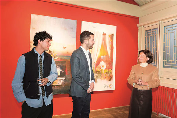 From left: Willmann with Nicolas Pillerel, minister counselor for culture, education and scientific affairs, the French embassy in China, and Christine Cayol, founder of Yishu 8, at the exhibition's opening on Dec 7. [Photo provided to China Daily]