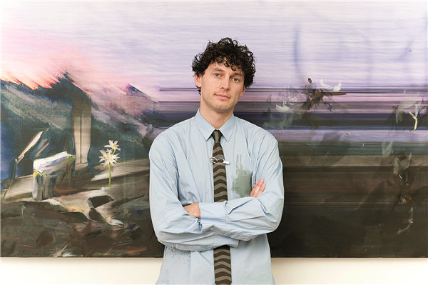 A visitor walks past a painting by French artist Gaspar Willmann at his solo exhibition, Compression, at Yishu 8 gallery in Beijing. [Photo provided to China Daily]