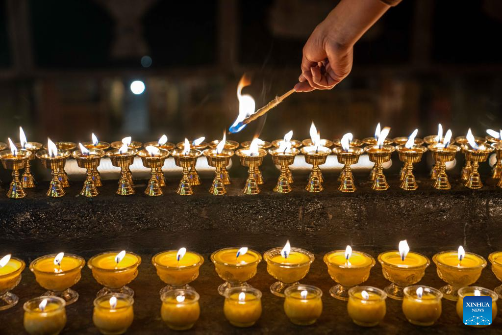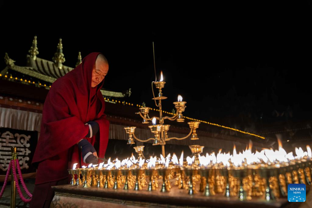A monk lights butter lamps at Jokhang Temple in Lhasa, the capital of southwest China's Xizang Autonomous Region, Dec. 25, 2024. People of the Tibetan ethnic group lit butter lamps and prayed through the night in the annual Butter Lamp Festival commemorating Tsong Khapa, a master of Tibetan Buddhism. (Xinhua/Tenzing Nima Qadhup)