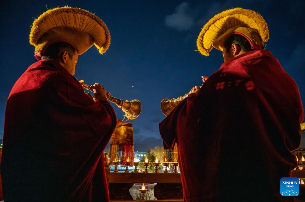 Monks participate in a ceremony at Jokhang Temple in Lhasa, the capital of southwest China's Xizang Autonomous Region, Dec. 25, 2024. People of the Tibetan ethnic group lit butter lamps and prayed through the night in the annual Butter Lamp Festival commemorating Tsong Khapa, a master of Tibetan Buddhism. (Xinhua/Tenzing Nima Qadhup)