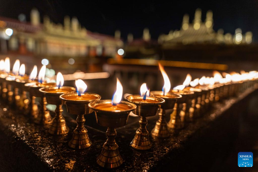 Butter lamps are lit up at Jokhang Temple in Lhasa, the capital of southwest China's Xizang Autonomous Region, Dec. 25, 2024. People of the Tibetan ethnic group lit butter lamps and prayed through the night in the annual Butter Lamp Festival commemorating Tsong Khapa, a master of Tibetan Buddhism. (Xinhua/Tenzing Nima Qadhup)