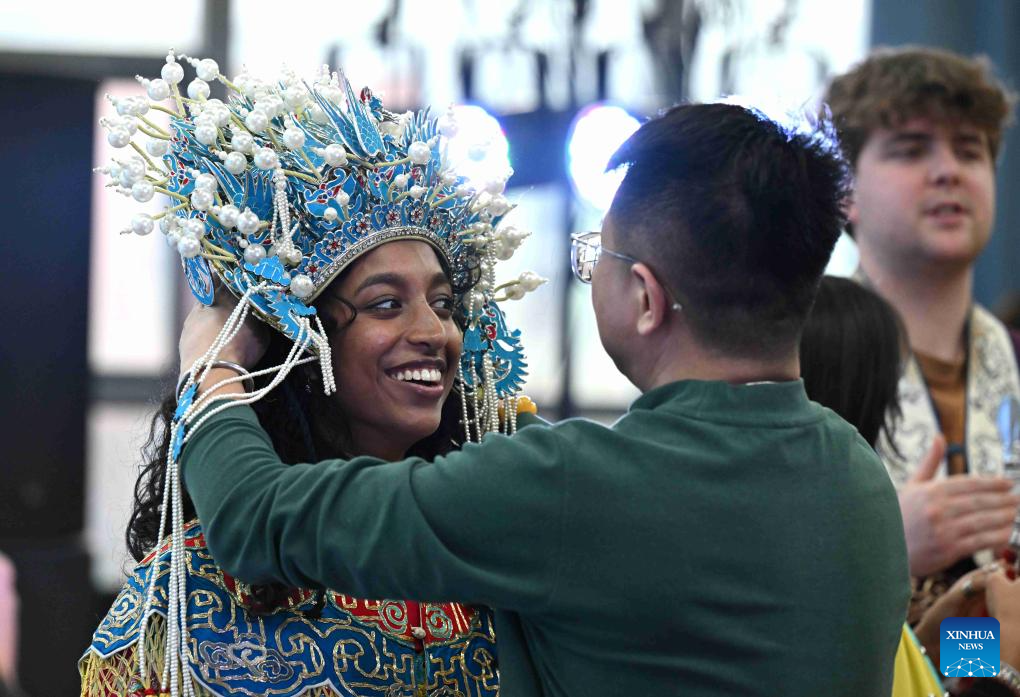 A U.S. college student tries a set of Peking Opera costumes in Shijiazhuang, north China's Hebei Province, Dec. 30, 2024. At the invitation of Shijiazhuang Foreign Language School, a group of U.S. teachers and students visit Shijiazhuang from Dec. 25 to Dec. 31. (Photo by Chen Qibao/Xinhua)