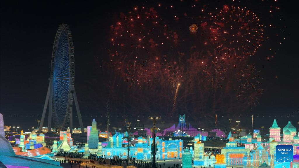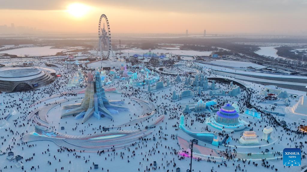 An aerial drone photo taken on Jan. 5, 2025 shows a view of the Harbin Ice-Snow World in Harbin, northeast China's Heilongjiang Province. Harbin, with its rich ice and snow resources and a diverse array of winter activities, has emerged as one of China's top winter travel destinations. (Xinhua/Wang Song)