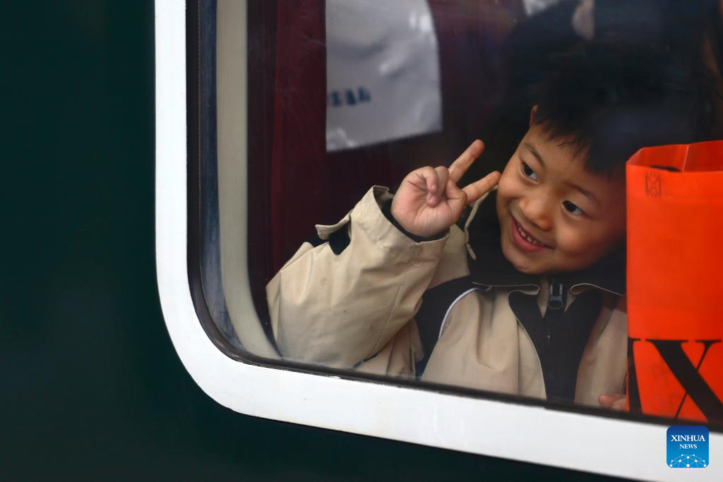 Two kids gesture aboard a train bound for Guiyang, southwest China's Guizhou Province, at Shanghai Hongqiao Railway Station in east China's Shanghai, Jan. 14, 2025. The Spring Festival, China's biggest traditional holiday, will fall on Jan. 29 this year. The Spring Festival travel rush, or chunyun, the world's largest annual human migration known for its high transportation demand as millions return home for family reunions, kicked off on Tuesday. (Photo by Chen Haoming/Xinhua)