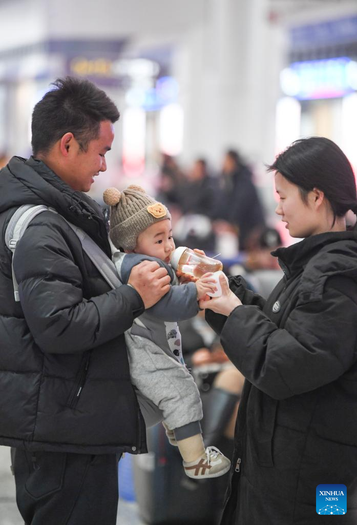 A family is pictured at Chongqing West Railway Station in southwest China's Chongqing Municipality, Jan. 14, 2025. The Spring Festival, China's biggest traditional holiday, will fall on Jan. 29 this year. The Spring Festival travel rush, or chunyun, the world's largest annual human migration known for its high transportation demand as millions return home for family reunions, kicked off on Tuesday. (Xinhua/Wang Quanchao)