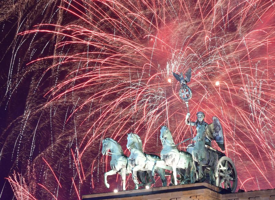 This photo taken on Dec. 31, 2023 shows fireworks exploding during a New Year celebration at the Brandenburg Gate in Berlin, Germany. (Xinhua/Ren Pengfei)