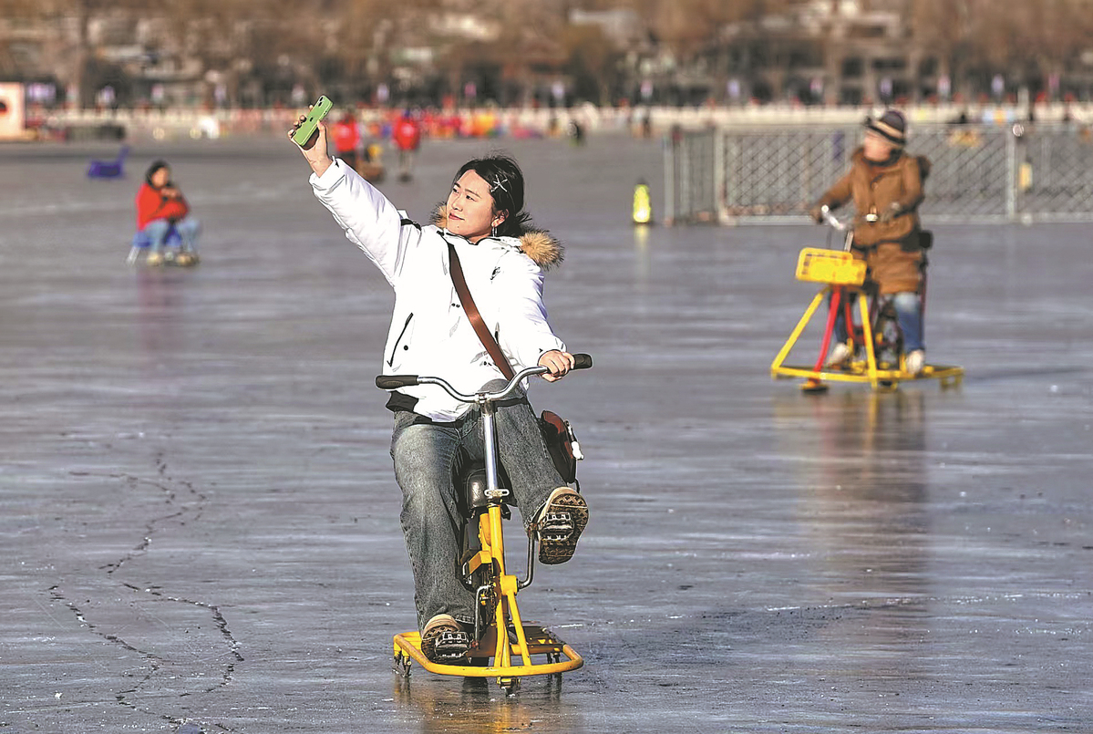 Visitors skate at an outdoor rink at Shichahai in Beijing on Friday. The rink was temporarily closed at midday due to high temperatures to ensure visitor safety. FANG FEI/FOR CHINA DAILY