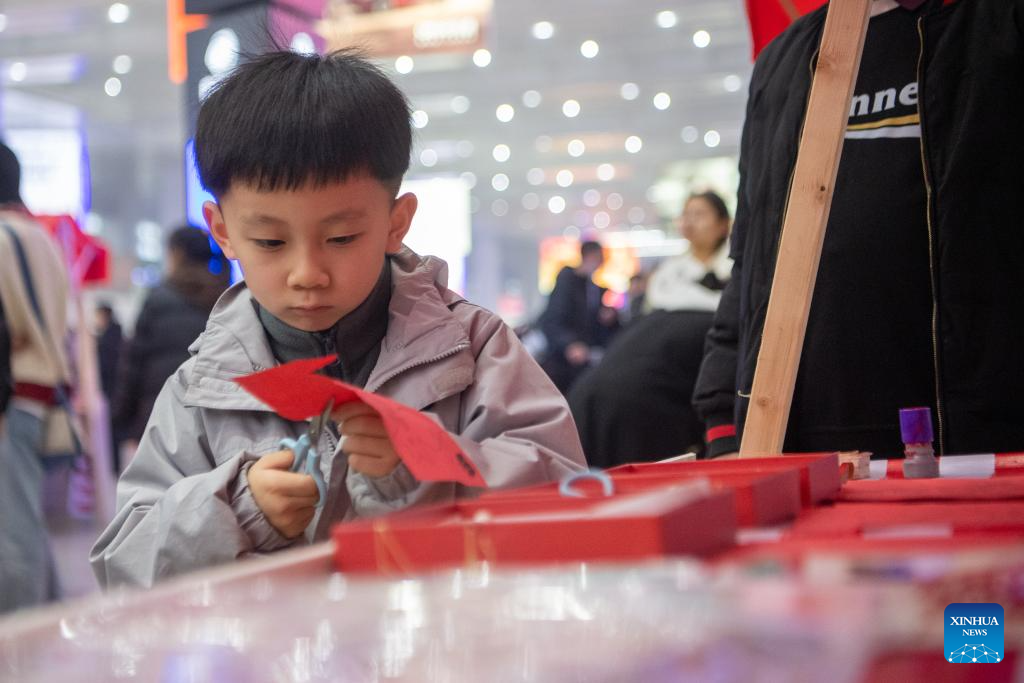 A boy learns making paper-cutting window decorations at Chongqing North Railway Station in southwest China's Chongqing, Jan. 23, 2025.