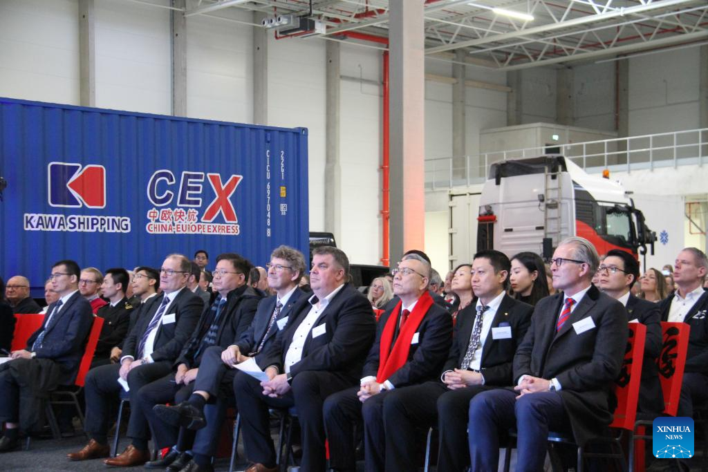 People attend a ceremony marking the completion of the maiden voyage of the first "China-Europe Express" container ship in Wilhelmshaven, Germany, on Jan. 24, 2025. The first container ship of the "China-Europe Express", the fastest direct route connecting Europe and China's Yangtze River Delta region, arrived at its destination at the Jade Weser Port in Wilhelmshaven on Friday. The "KAWA Ningbo" cargo ship, carrying over 1700 containers of new-energy and other high-value goods, completed its non-stop voyage in 26 days, well below the shipment time of 45 days in the past. (Xinhua/Shan Weiyi)