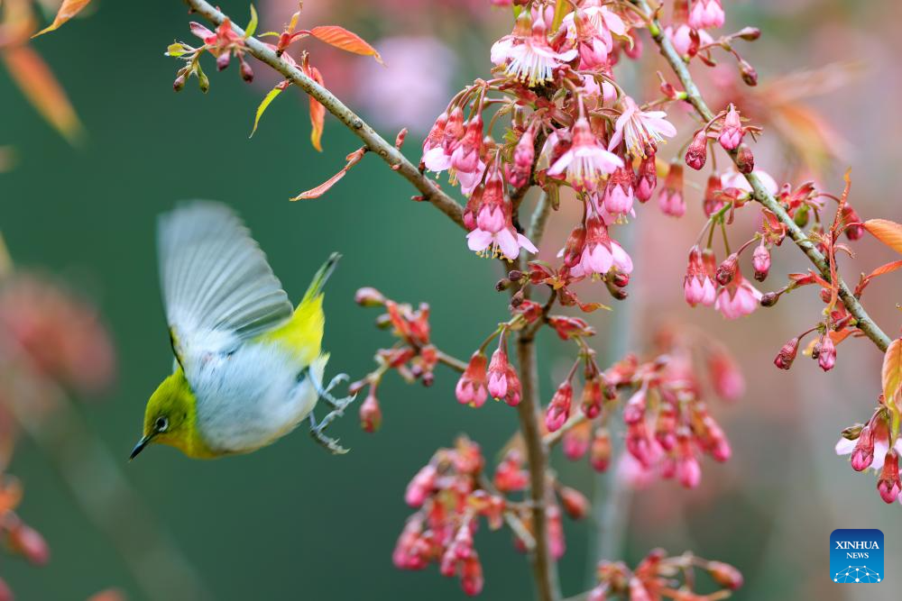 A white-eye bird flies over blossoms on a street of Guiyang City, southwest China's Guizhou Province, Feb. 8, 2025. (Xinhua/Liu Xu)