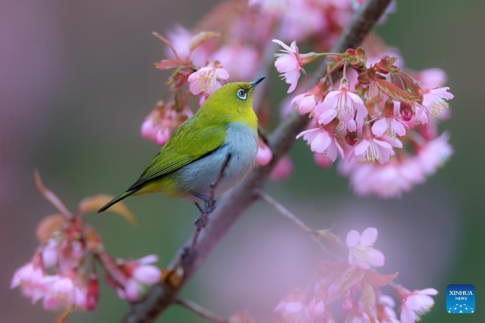 A white-eye bird perches over blossoms on a street of Guiyang City, southwest China's Guizhou Province, Feb. 8, 2025. (Xinhua/Liu Xu)