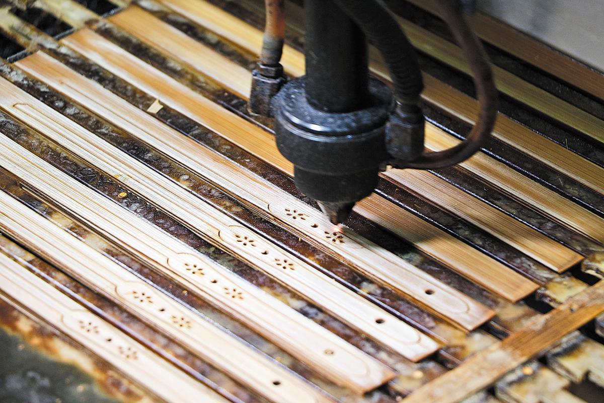 A machine carves out patterns on a bamboo fan in Anji in March 2023. SHI ZINAN/CHINA NEWS SERVICE