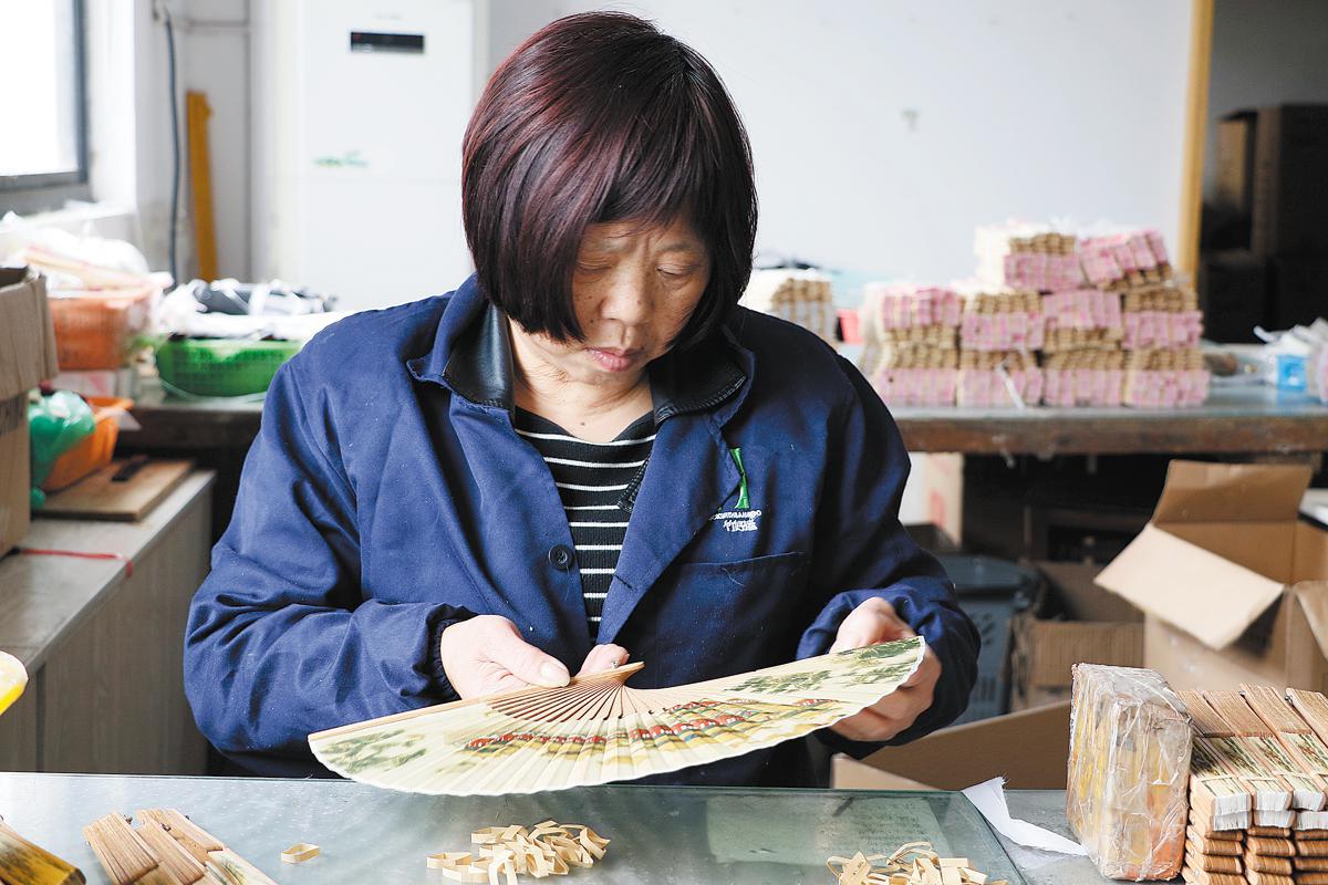 A worker checks the quality of a bamboo fan in Anji in March 2023. SHI ZINAN/CHINA NEWS SERVICE