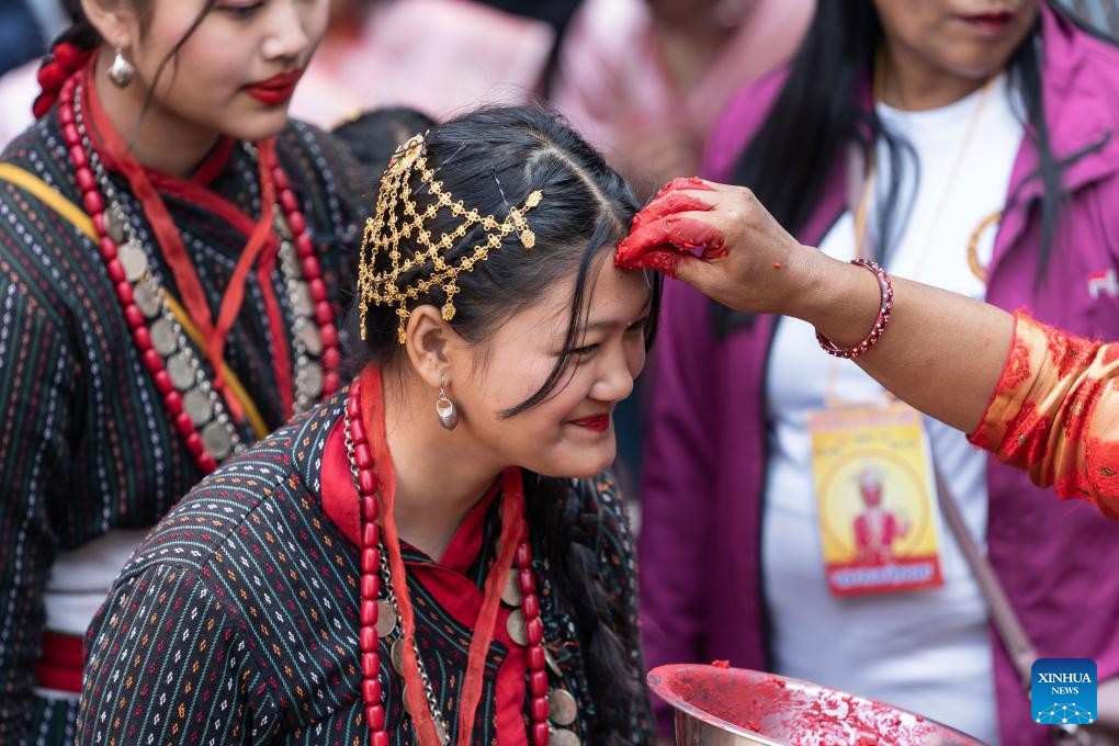 A girl from Newari community receives a tika on her forehead as a blessing during a parade celebrating the Bhimsen Puja festival in Lalitpur, Nepal, Feb. 9, 2025. (Photo by Hari Maharjan/Xinhua)