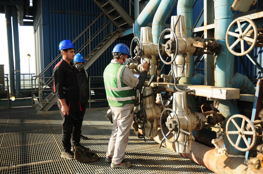 Staff members from China check the equipment at the Wasit Power Plant, in Wasit Province, Iraq, Feb. 10, 2025. (Xinhua/Duan Minfu)