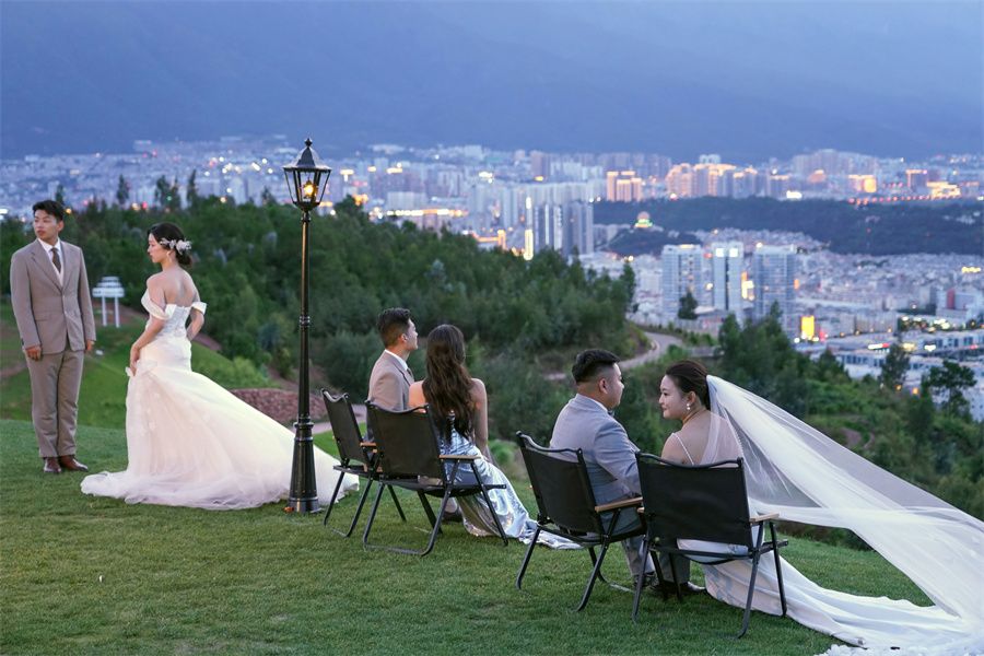 Newly married couples seen at a photo shoot in Yunxiang Mountain in Dali, Yunnan province, on July 18. [CHINA DAILY]