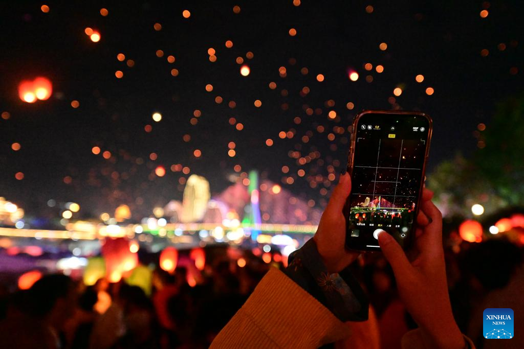 A visitor takes a photo of Kongming lanterns, a kind of small hot-air paper balloon, by the Lancang River in Jinghong City, Xishuangbanna Dai Autonomous Prefecture, southwest China's Yunnan Province, April 13, 2025. A variety of folk cultural activities were held in Xishuangbanna Dai Autonomous Prefecture to celebrate the New Year of the calendar of the Dai ethnic group, which is also called the water-splashing festival. (Xinhua/Gao Yongwei)