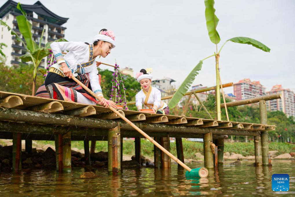 Local people fetch water to celebrate the New Year of the calendar of the Dai ethnic group, which is also called the water-splashing festival, by the Lancang River in Jinghong City, Xishuangbanna Dai Autonomous Prefecture, southwest China's Yunnan Province, April 15, 2025. The water-splashing festival is regarded as one of the most important festivals of ethnic groups in southwest China. During the festival, water is considered an auspicious symbol and people splash water on one another, thereby wishing happiness and good fortune. (Xinhua/Gao Yongwei)