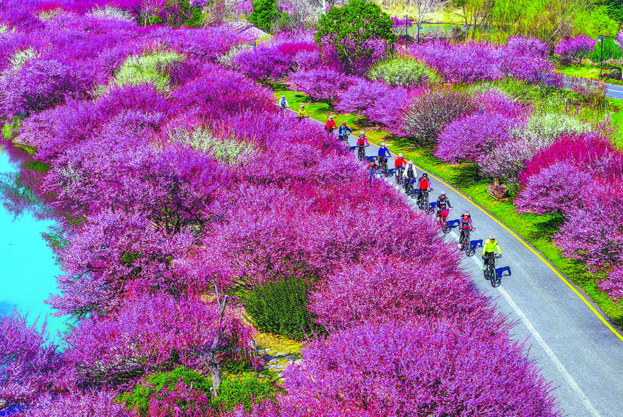 Cycling enthusiasts ride through a park in Changxing county, Zhejiang province, in March. [PHOTO BY CHEN HAIWEI/FOR CHINA DAILY]