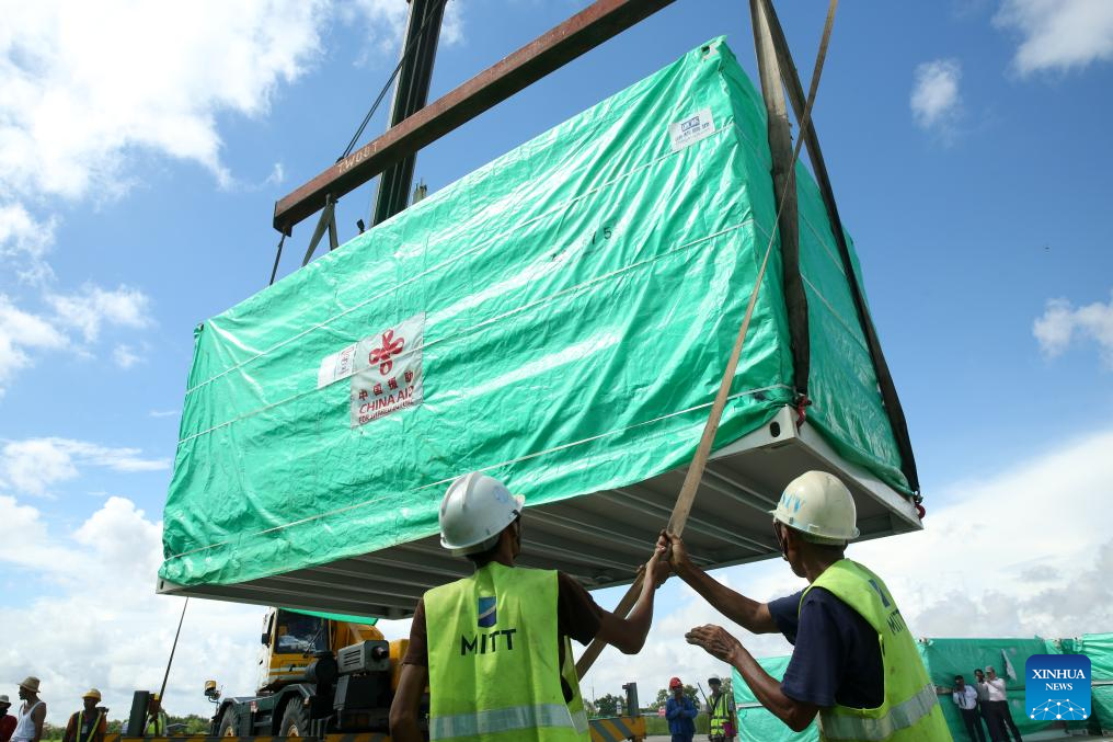 This photo taken on May 14, 2025 shows the 14th batch of emergency humanitarian in-kind assistance dispatched by the Chinese government in Yangon, Myanmar. The 14th batch of emergency humanitarian in-kind assistance dispatched by the Chinese government was handed over to Myanmar on Wednesday. A 7.9-magnitude earthquake struck Myanmar on March 28. As of May 13, the earthquake has claimed around 3,800 lives and injured over 5,100 people, with 85 others remaining unaccounted for, according to official data. (Xinhua/Myo Kyaw Soe)