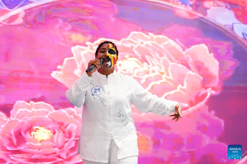 A contestant performs during the 24th "Chinese Bridge" Chinese Proficiency Competition for Foreign College Students in Colombo, Sri Lanka, June 3, 2025. Two Sri Lankan university students won first prize at the 24th "Chinese Bridge" Chinese Proficiency Competition for Foreign College Students, which was held at Colombo Port City on Tuesday. The event, held by the Chinese Embassy in Sri Lanka, was organized by the Confucius Institute at the University of Kelaniya in partnership with CHEC Port City Colombo (Pvt) Ltd. (Xinhua/Chen Dongshu)