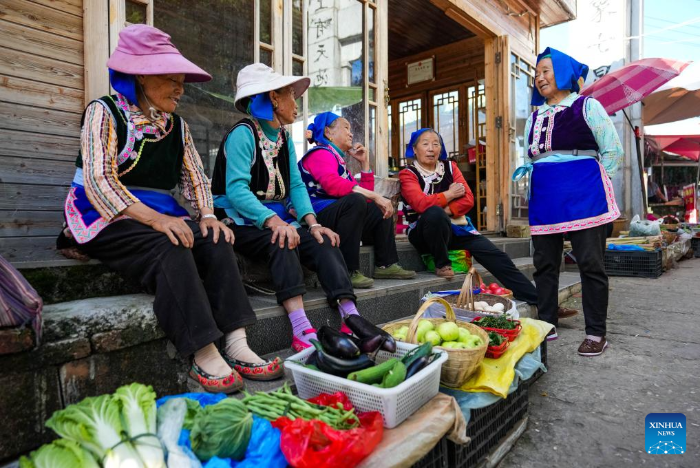 Yi villagers chat at a wet market in Leju Village in Xishan District of Kunming City, southwest China's Yunnan Province, July 27, 2025. Leju Village in Kunming is an ancient Yi ethnic village with a history of over 600 years. Its name, derived from the Yi language, means "the village at the foot of the rocky mountain," and it is renowned for its unique residential architecture.