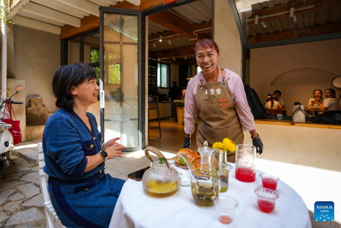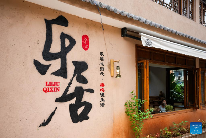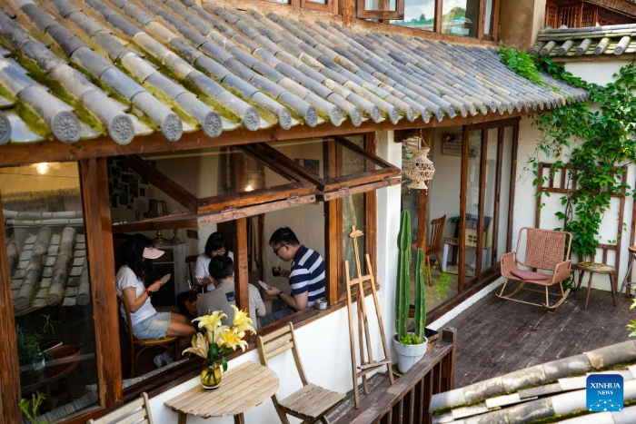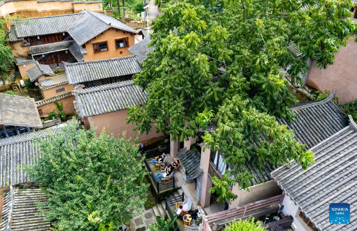 Tourists are pictured at a cafe in Leju Village in Xishan District of Kunming City, southwest China's Yunnan Province, July 27, 2025. Leju Village in Kunming is an ancient Yi ethnic village with a history of over 600 years. Its name, derived from the Yi language, means "the village at the foot of the rocky mountain," and it is renowned for its unique residential architecture.(Xinhua/Chen Xinbo)
