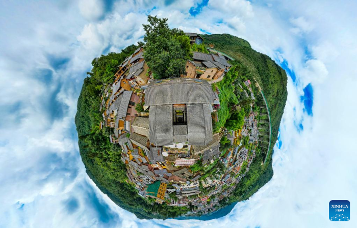 A drone panoramic photo taken on July 27, 2025 shows a view in Leju Village in Xishan District of Kunming City, southwest China's Yunnan Province. Leju Village in Kunming is an ancient Yi ethnic village with a history of over 600 years. Its name, derived from the Yi language, means "the village at the foot of the rocky mountain," and it is renowned for its unique residential architecture.(Xinhua/Chen Xinbo)