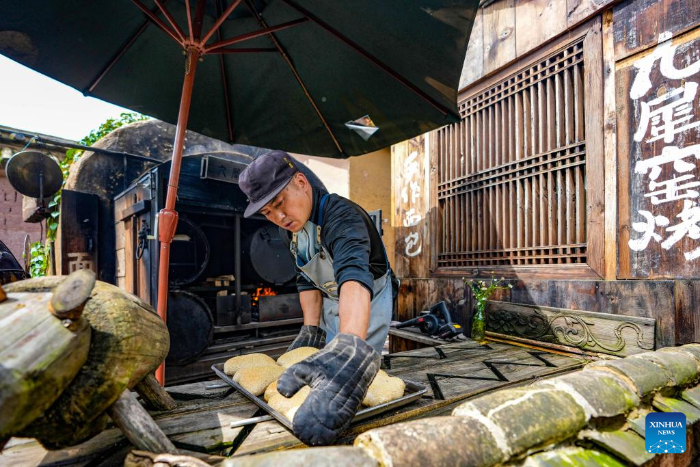 A staff member makes bread at a bakery in Leju Village in Xishan District of Kunming City, southwest China's Yunnan Province, July 27, 2025. Leju Village in Kunming is an ancient Yi ethnic village with a history of over 600 years. Its name, derived from the Yi language, means "the village at the foot of the rocky mountain," and it is renowned for its unique residential architecture.(Xinhua/Chen Xinbo)