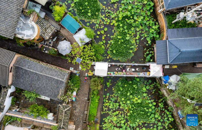 A drone photo taken on July 23, 2025 shows a pond in Leju Village in Xishan District of Kunming City, southwest China's Yunnan Province. Leju Village in Kunming is an ancient Yi ethnic village with a history of over 600 years. Its name, derived from the Yi language, means "the village at the foot of the rocky mountain," and it is renowned for its unique residential architecture.(Xinhua/Chen Xinbo)