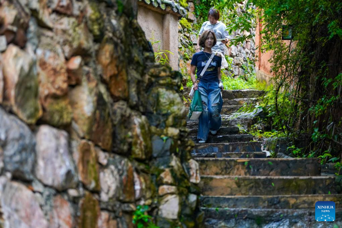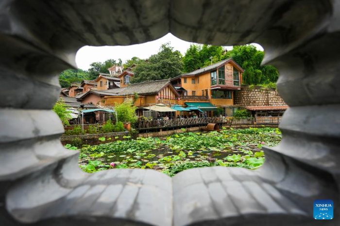 Tourists are pictured in Leju Village in Xishan District of Kunming City, southwest China's Yunnan Province, July 27, 2025. Leju Village in Kunming is an ancient Yi ethnic village with a history of over 600 years. Its name, derived from the Yi language, means "the village at the foot of the rocky mountain," and it is renowned for its unique residential architecture.(Xinhua/Chen Xinbo)