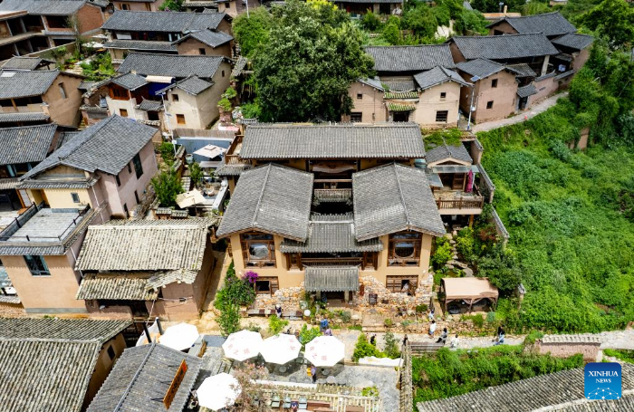 A drone photo taken on July 27, 2025 shows a homestay in Leju Village in Xishan District of Kunming City, southwest China's Yunnan Province. Leju Village in Kunming is an ancient Yi ethnic village with a history of over 600 years. Its name, derived from the Yi language, means "the village at the foot of the rocky mountain," and it is renowned for its unique residential architecture.(Xinhua/Chen Xinbo)
