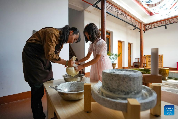 A child experiences soya bean milk making in Leju Village in Xishan District of Kunming City, southwest China's Yunnan Province, July 27, 2025. Leju Village in Kunming is an ancient Yi ethnic village with a history of over 600 years. Its name, derived from the Yi language, means "the village at the foot of the rocky mountain," and it is renowned for its unique residential architecture.(Xinhua/Chen Xinbo)