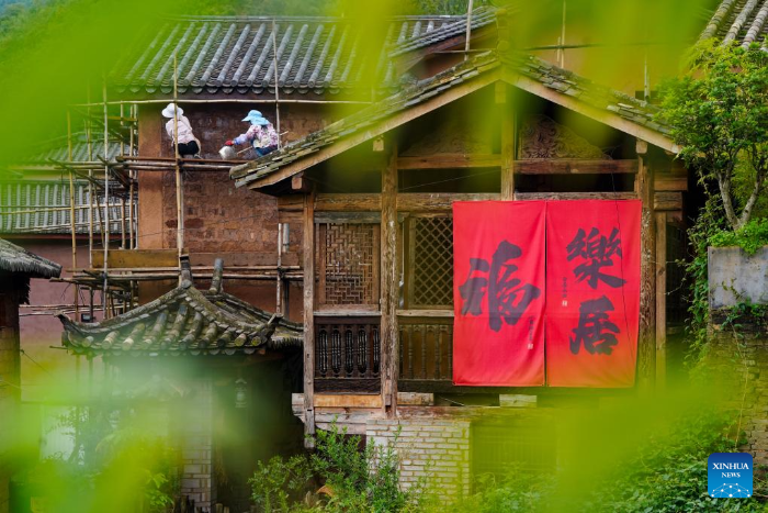 Workers paint a wall in Leju Village in Xishan District of Kunming City, southwest China's Yunnan Province, July 23, 2025. Leju Village in Kunming is an ancient Yi ethnic village with a history of over 600 years. Its name, derived from the Yi language, means "the village at the foot of the rocky mountain," and it is renowned for its unique residential architecture.(Xinhua/Chen Xinbo)