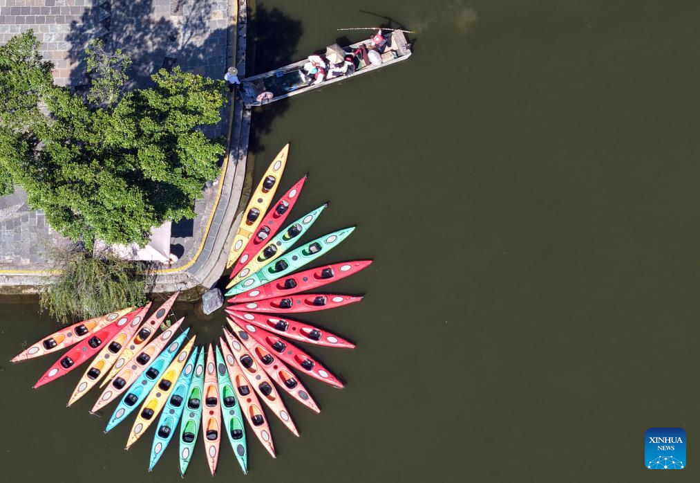 Tourists take a boat in Xihu wetland park in Eryuan County, Dali Bai Autonomous Prefecture, southwest China's Yunnan Province, July 29, 2025. (Photo by Liang Zhiqiang/Xinhua)