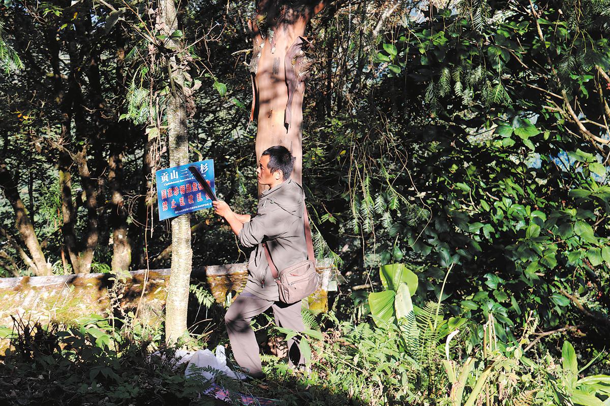 A worker hangs a sign marking an endangered tree in Yunnan province. CHINA DAILY