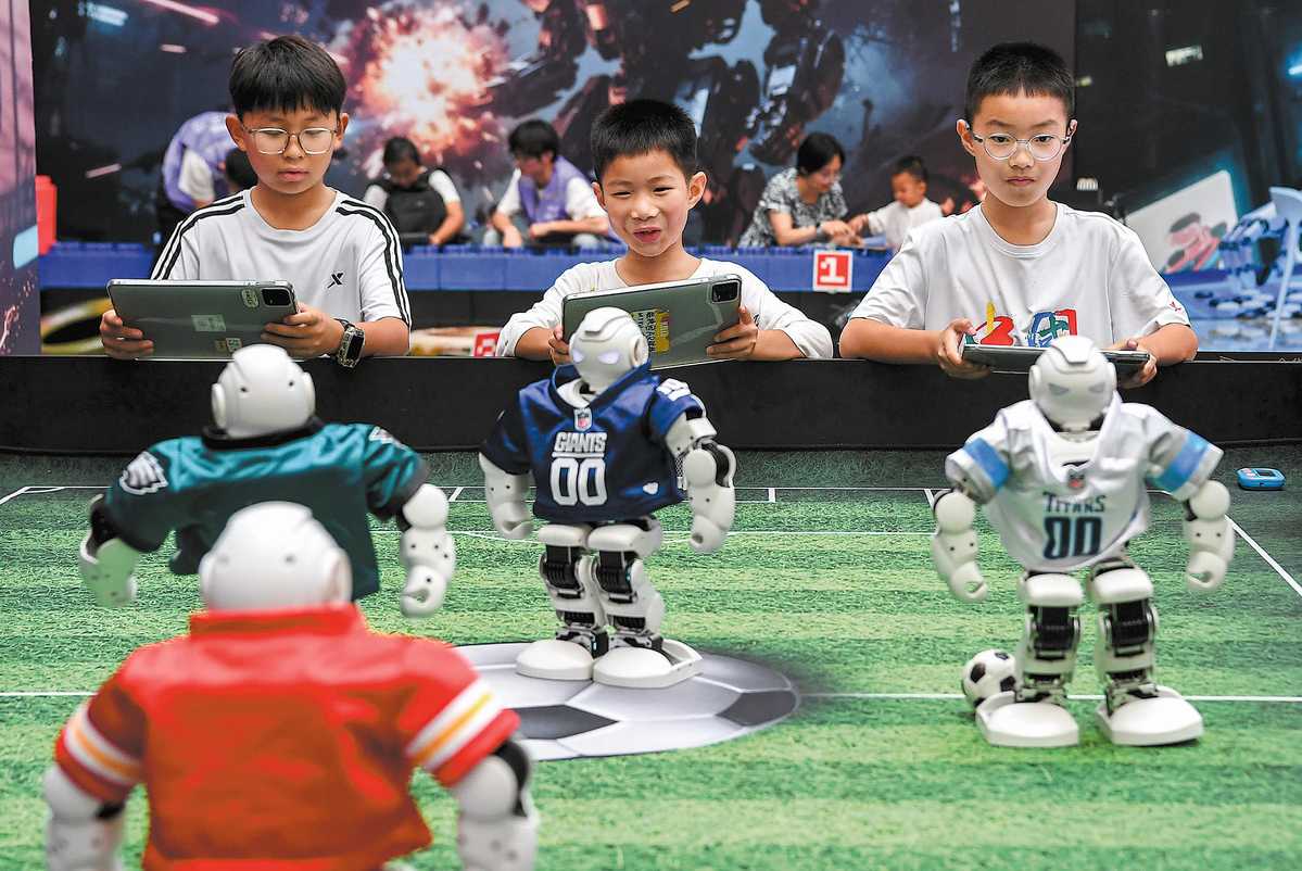 Children interact with soccer robots at a science museum in Jinhua, Zhejiang province, on July 6. SHI KUANBING/XINHUA