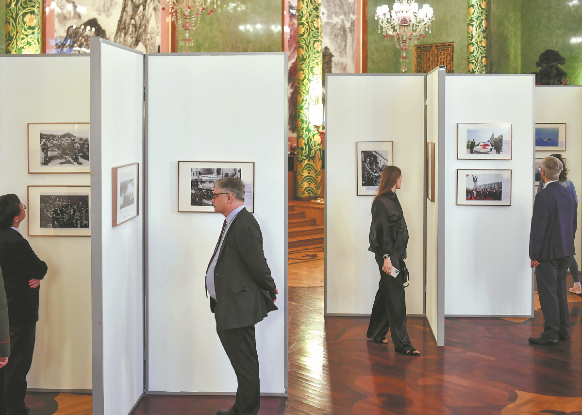 Guests view a photo exhibition commemorating the 80th anniversary of China's victory in the War of Resistance Against Japanese Aggression (1931-45) and the World Anti-Fascist War in Moscow, Russia, on April 18.[Photo/Xinhua]