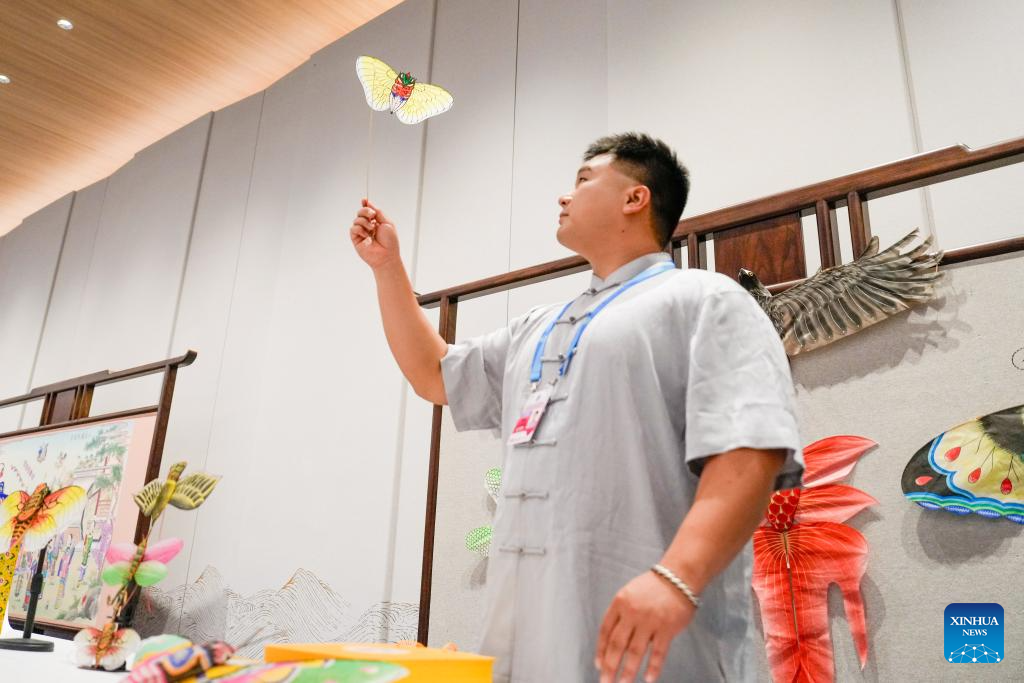 A staff member displays kite-making craft before a welcoming banquet at the Meijiang Convention and Exhibition Center in Tianjin, north China, Aug. 31, 2025. Chinese President Xi Jinping and his wife, Peng Liyuan, on Sunday hosted a banquet in China's port city of Tianjin to welcome international guests who are here to attend the Shanghai Cooperation Organization (SCO) Summit 2025.