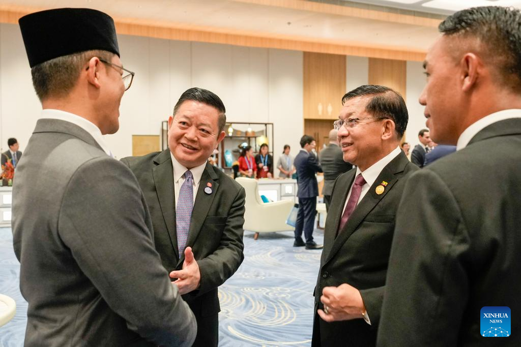 Guests communicate before a welcoming banquet at the Meijiang Convention and Exhibition Center in Tianjin, north China, Aug. 31, 2025. Chinese President Xi Jinping and his wife, Peng Liyuan, on Sunday hosted a banquet in China's port city of Tianjin to welcome international guests who are here to attend the Shanghai Cooperation Organization (SCO) Summit 2025.