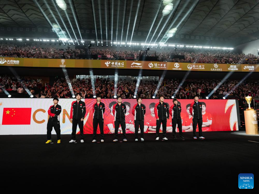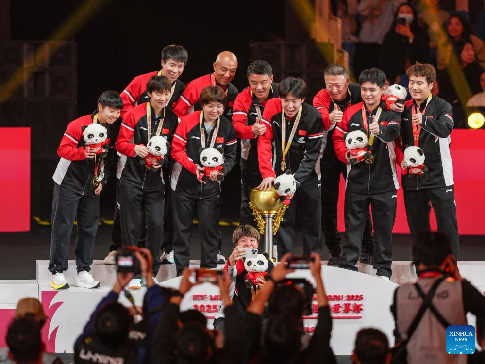 Gold medalists team China pose during the awarding ceremony at the ITTF Mixed Team World Cup 2025 in Chengdu, southwest China's Sichuan Province, Dec. 7, 2025. (Xinhua/Wang Ying)
