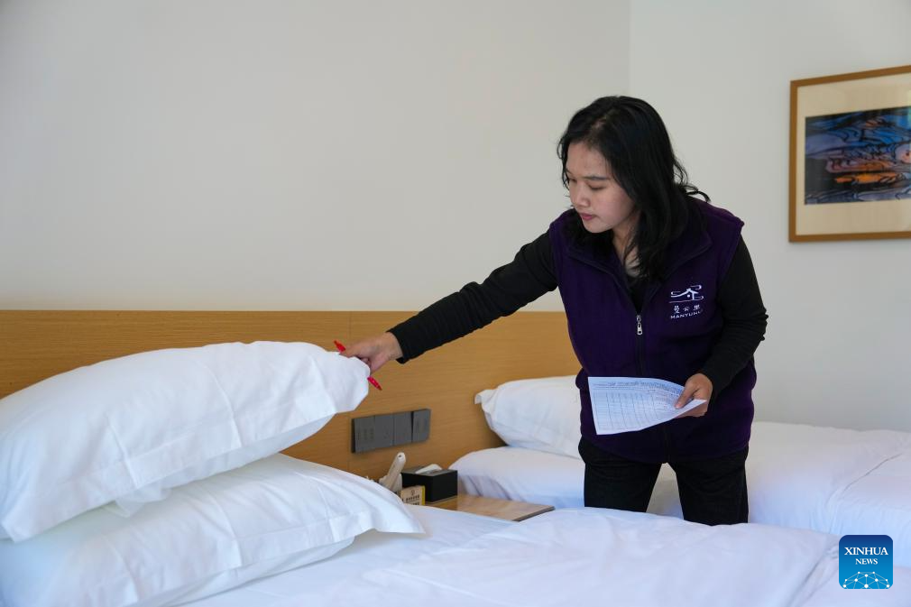A villager checks inside a homestay in Manhai Village, Mojiang Hani Autonomous County of Pu'er City, southwest China's Yunnan Province, Dec. 20, 2025.(Xinhua/Chen Xinbo)