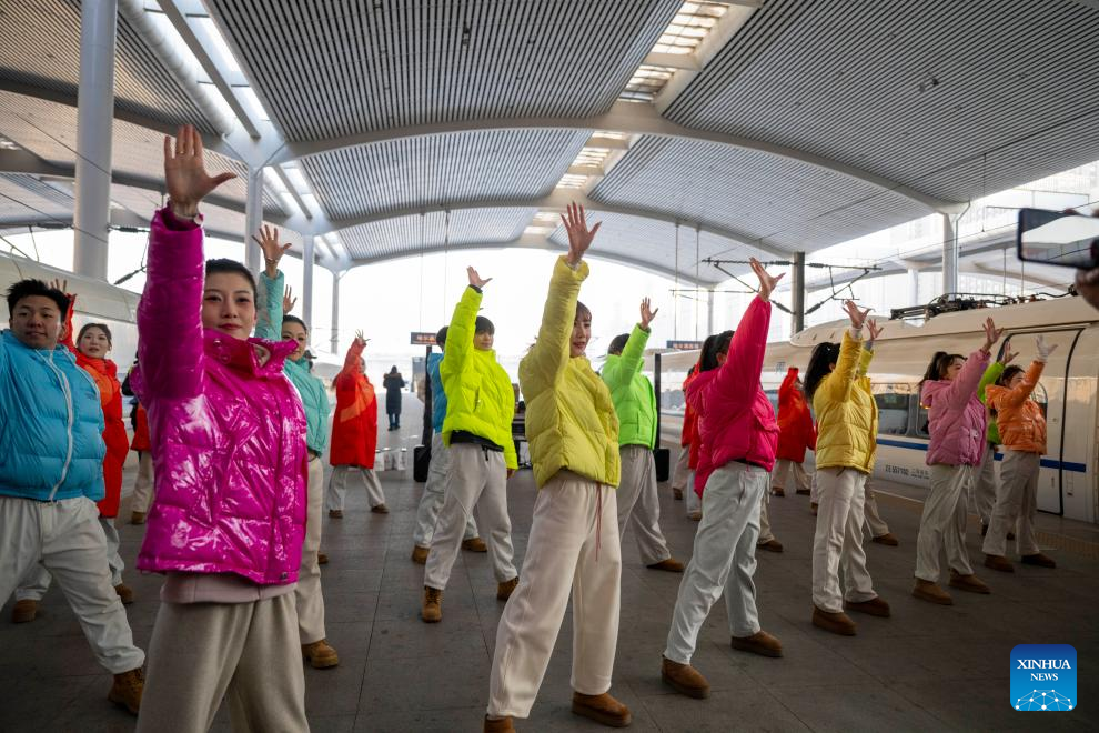 Performers dance outside the bullet train No.G1276, the first themed high-speed train of the Harbin Ice-Snow World, at Harbin West Station in Harbin, northeast China's Heilongjiang Province, Jan. 4, 2026. The first high-speed train with the theme of the Harbin Ice-Snow World began service from Harbin West Station on Sunday, heading for Wuhan City in central China's Hubei Province. Featuring unique interior and exterior decorations of the Harbin Ice-Snow World, the themed high-speed train serves as a mobile emblem to boost the ice and snow economy. (Xinhua/Zhang Tao)