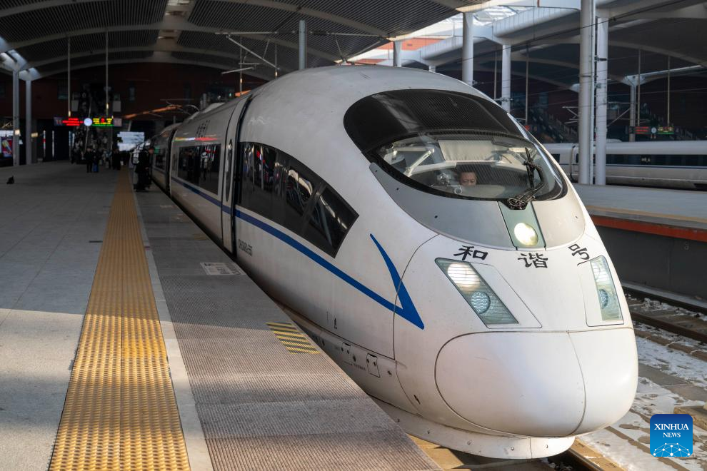 The bullet train No.G1276, the first themed high-speed train of the Harbin Ice-Snow World, departs from Harbin West Station in Harbin, northeast China's Heilongjiang Province, Jan. 4, 2026. The first high-speed train with the theme of the Harbin Ice-Snow World began service from Harbin West Station on Sunday, heading for Wuhan City in central China's Hubei Province. Featuring unique interior and exterior decorations of the Harbin Ice-Snow World, the themed high-speed train serves as a mobile emblem to boost the ice and snow economy. (Photo by Liu Yang/Xinhua)