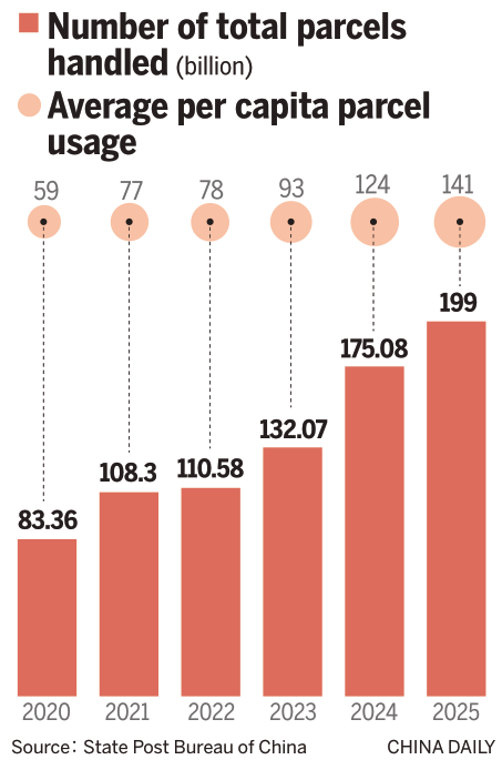 In 2025, the sector handled 199 billion parcels, up 13.7 percent year-on-year, according to data released on Wednesday during the annual conference of the State Post Bureau of China in Beijing. Revenue from express delivery services reached 1.5 trillion yuan ($214 billion), marking a 6.5 percent year-on-year increase, the data showed.