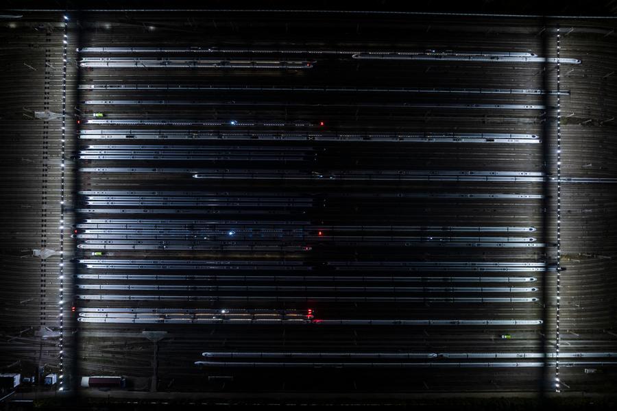 An aerial drone photo taken on Feb. 1, 2026 shows high-speed trains at a train depot in Wuhan, central China's Hubei Province. (Xinhua/Wu Zhizun)