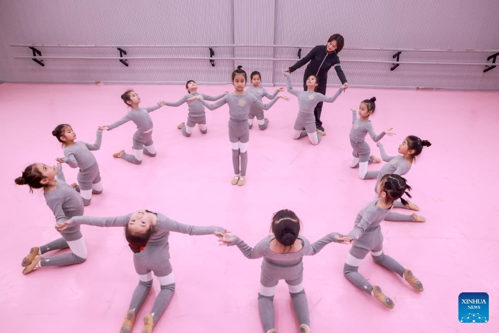 Children rehearse a dance under the guidance of an instructor at an art education center in Wuhan, central China's Hubei Province, on Feb. 8, 2026. Various extracurricular activities are available for students across China during the winter vacation. (Photo by Zhao Jun/Xinhua)